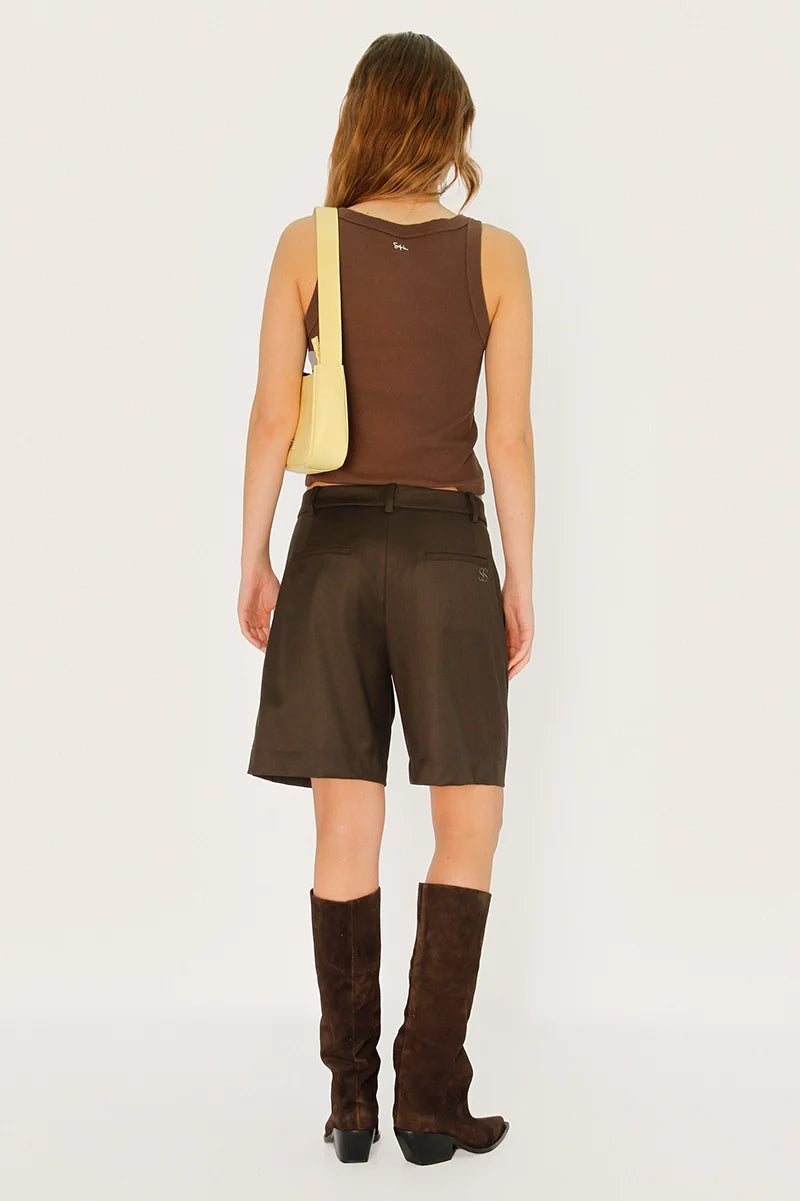 Bermuda sastrera con pinzas Drip gris. Cintura sastrera con ganchitos internos para colocación. Largo modular por mitad de rodillas. Tela de peso medio, levemente rígida para dar estructura. Logo bordado SS en espalda.