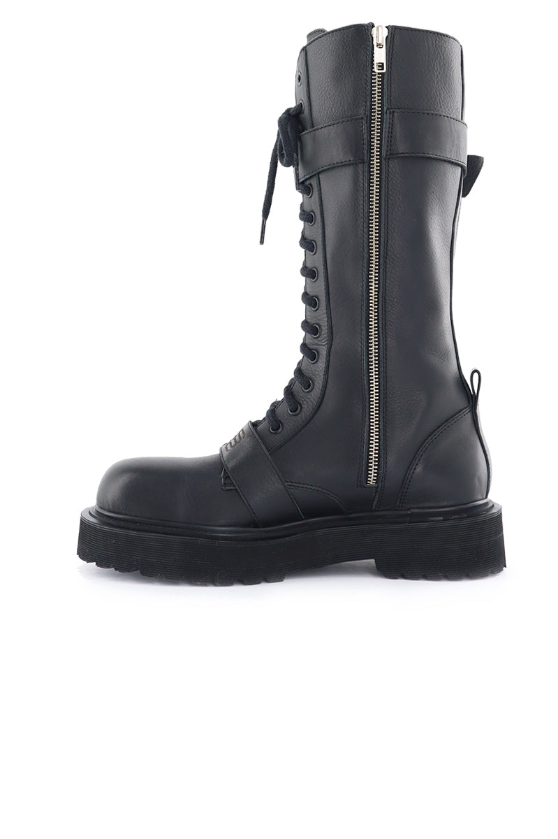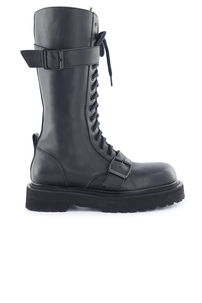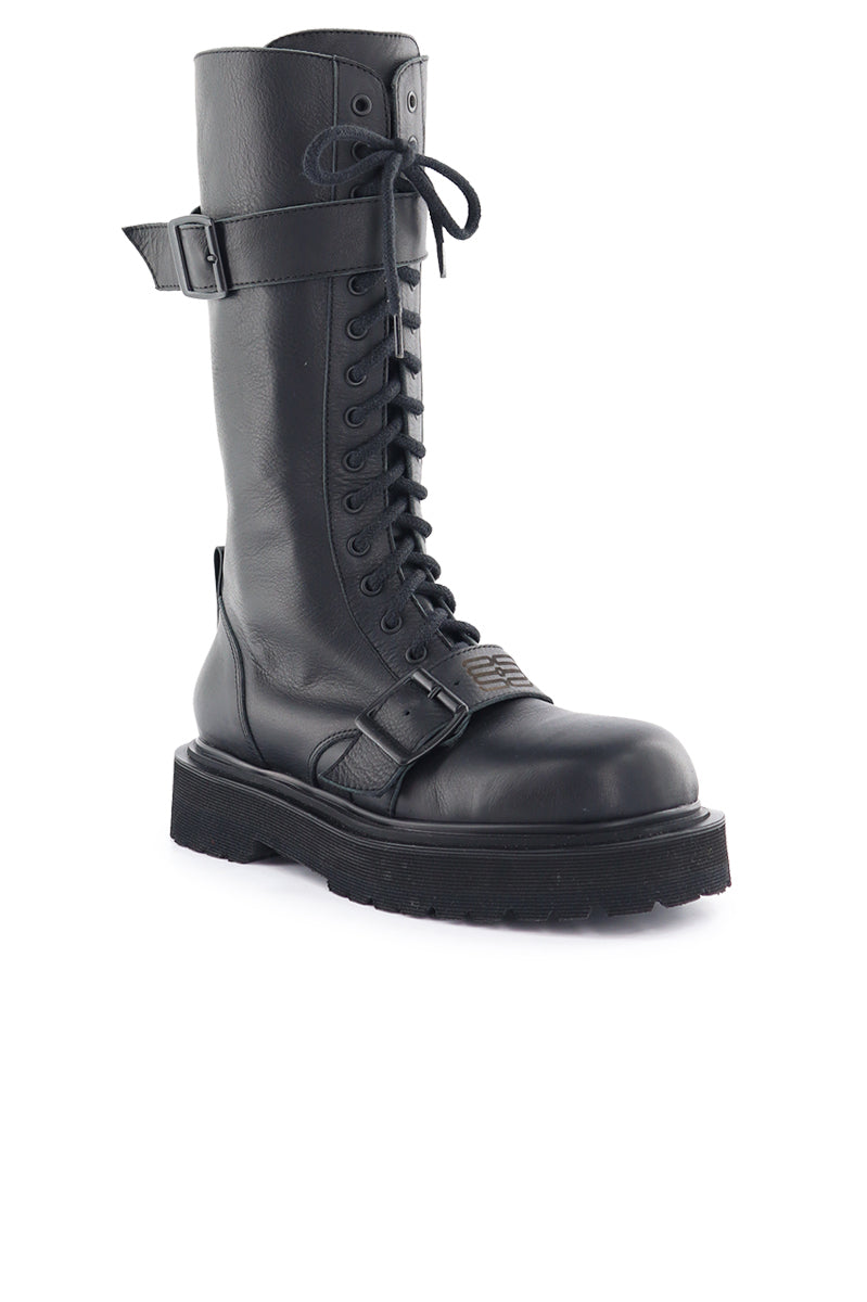 Borcego Cial negro caña alta de cuero negro con cordones y dos tiras con hebilla en baño negro. En la tira del empeine, el logo grabado a fuego. Cierre lateral interno de acceso. Forrería de fibras animal friendly. Fondo inyectado negro de 4 cm de altura. Altura de caña de 30 cm.