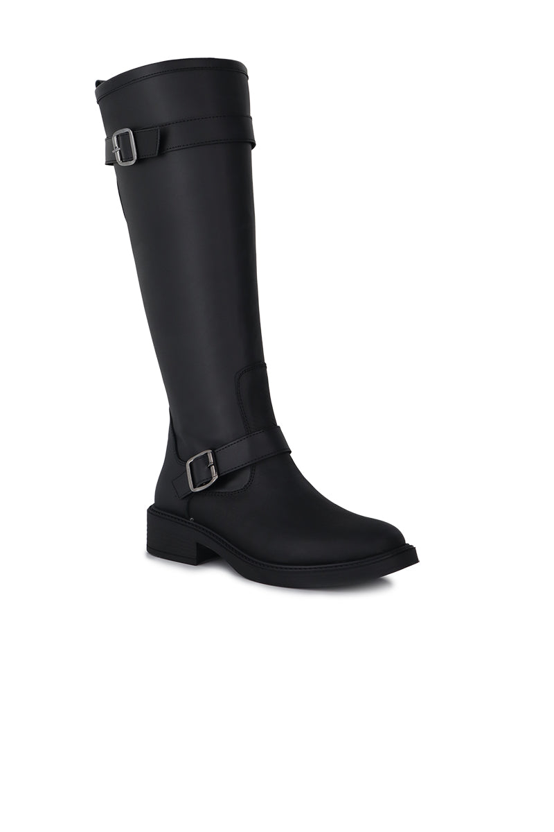 Bota Flur negra de cuero con doble hebilla en empeine y caña. Solapita con herraje SS en la parte de atrás. Cierre interno. Fondo inyectado con una altura de 4 cm. Altura de caña de 39 cm. La circunferencia de caña en el talle 36 es de 39 cm (la medida varia según talle).