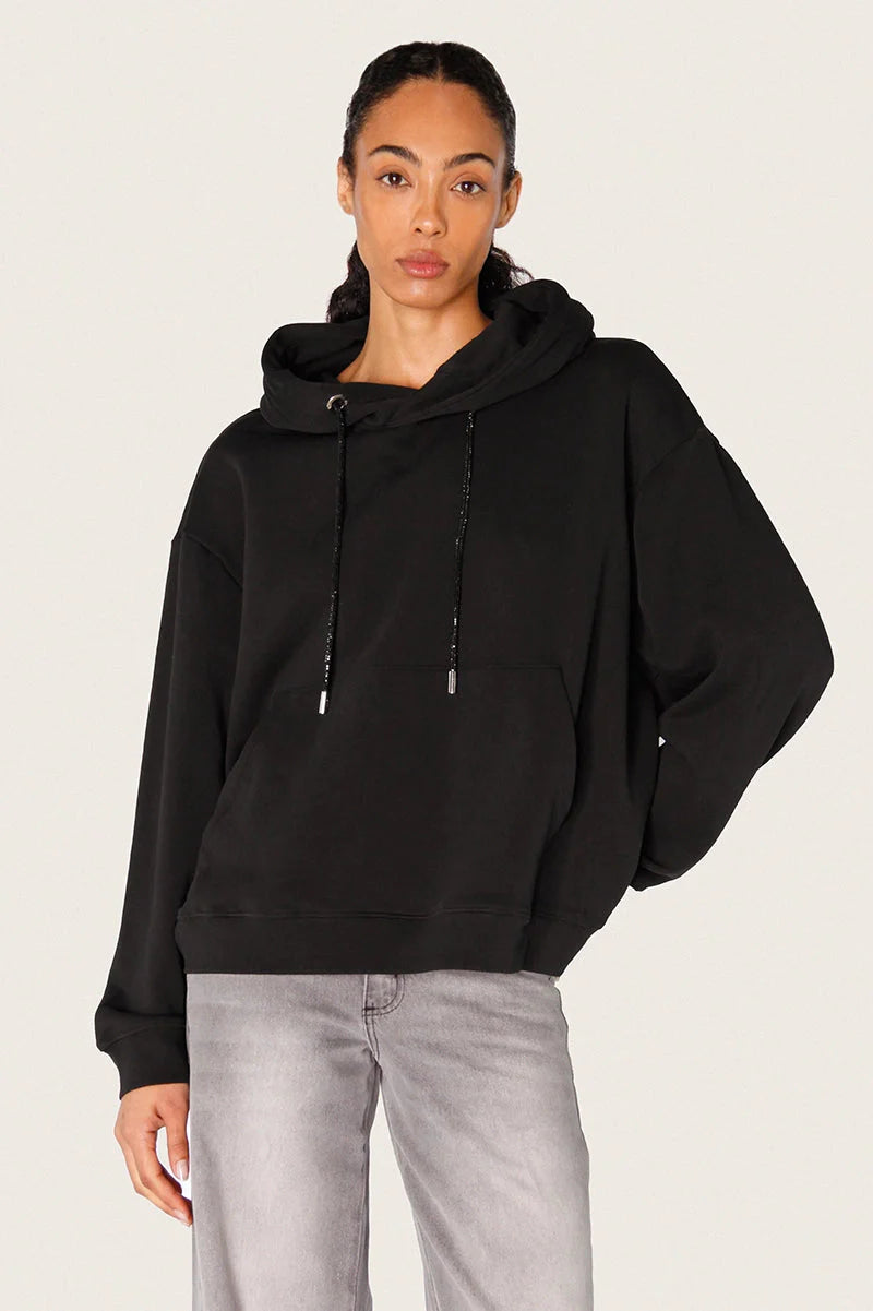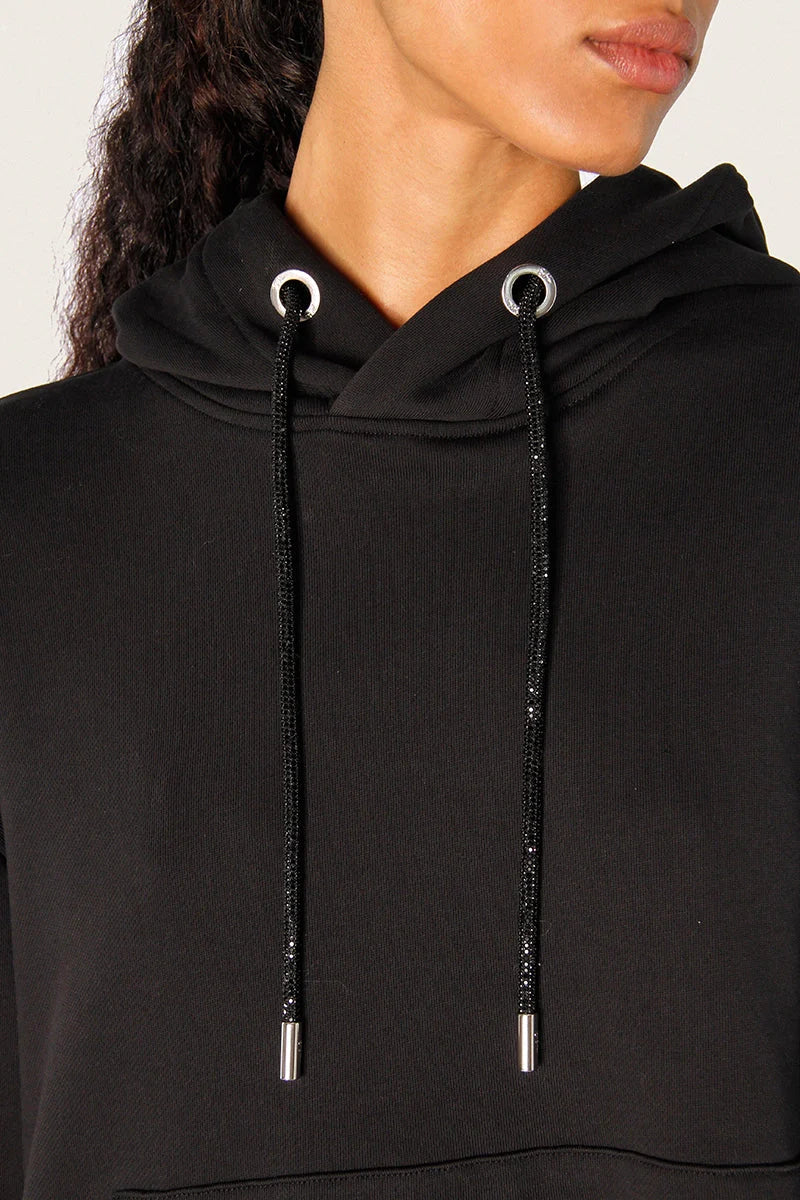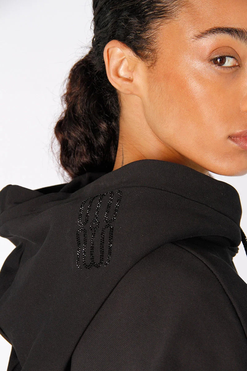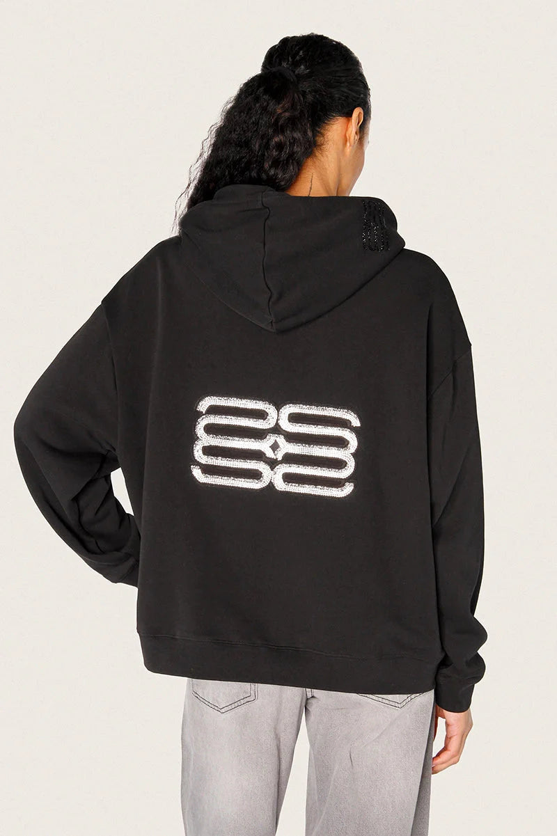 Hoodie Roza color negro oversized confeccionado en rústico de algodón de peso medio. Su diseño incorpora bolsillo canguro, cordón de ajuste con strass, terminales personalizadas y arandelas niqueladas a tono. También tiene la tirilla de limpieza del cuello de espalda del lado interno estampada con logos de marca, mientras que en la espalda se destaca un parche exclusivo con el logo realizado en strass. Su largo modular queda por debajo de la cadera, ofreciendo un calce cómodo y actual. Una prenda con detalles que elevan cualquier look.