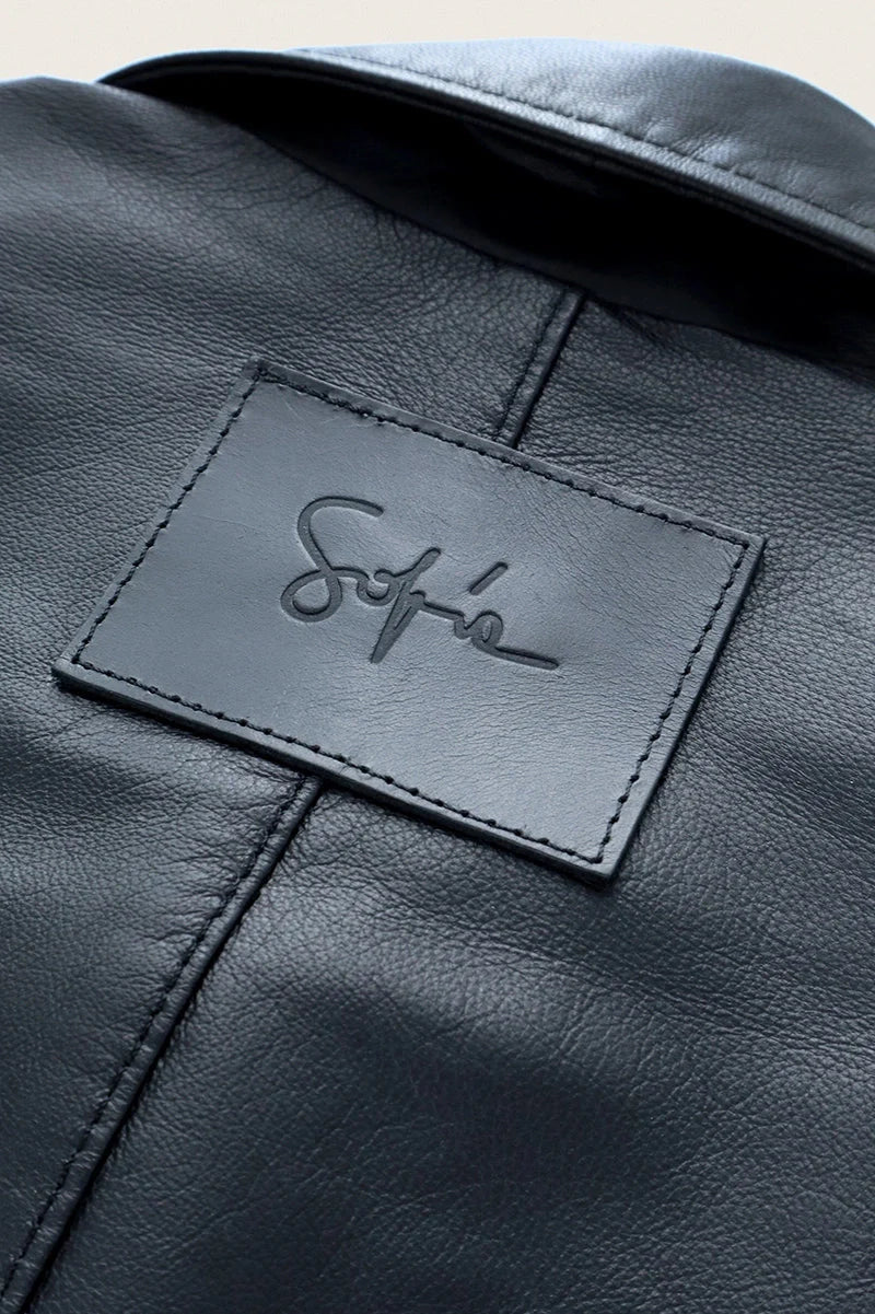 Campera Rume negra tipo bomber confeccionada en cuero suave al tacto y de peso medio. Su diseño presenta puños con elástico y cierre delantero con tiracierre personalizado, acompañado por una pestaña con botones snaps niquelados que lo cubren. En la espalda, incluye badana de cuero con el logo Sofía como detalle marcario. El largo modular llega hasta la cadera, logrando un calce cómodo y actual. Una prenda urbana con carácter, ideal para completar tus looks con estilo.