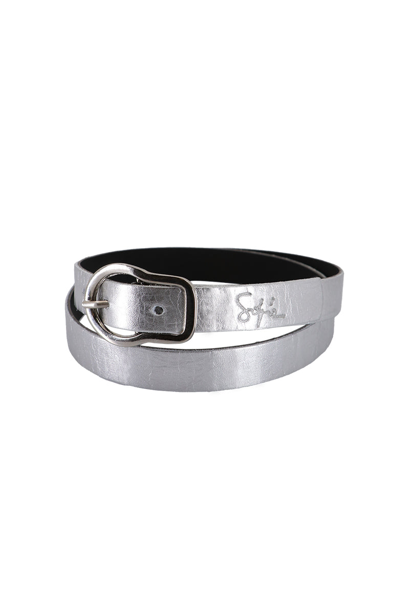 Cinturón Onis color plata de cuero, ancho 2 cm, con hebilla niquel y logo LUMIARA grabado.