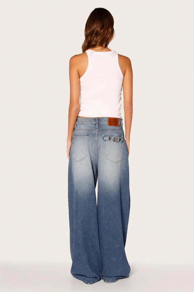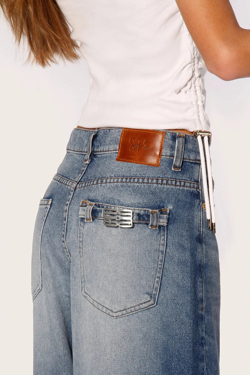 Jean de denim Aira azul 100% algodón, con tiro y peso medio. Pierna amplia y largo modular hasta los talones para un fit cómodo y con estilo. Lleva en el bolsillo plaqué de espalda un cinturón con logo marcario cambrado que se adapta al cuerpo, y una badana con logo 3D que suma un detalle de marca con relieve.