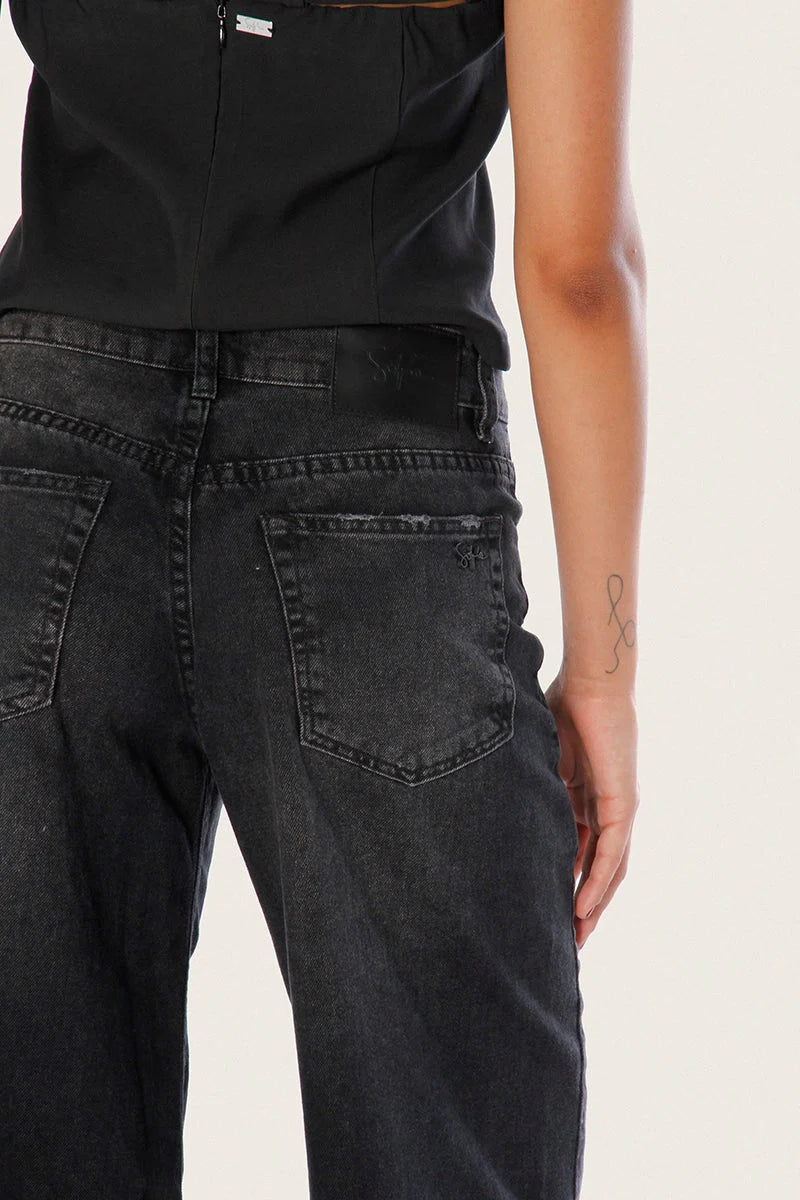 Jean Grim de denim 100% algodón color negro. Tiro medio con cintura clásica. Ruedo de color denim más oscuro que simula ser doble denim. Ruedo al corte. Largo modular por talones.