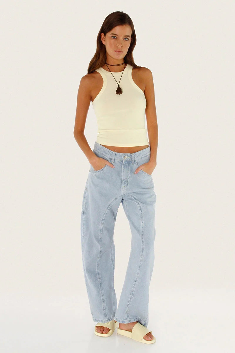 Jean Lich celeste confeccionado en denim 100% algodón con cintura martillo y corte recto. Su diseño incluye recortes curvos con costuras jeaneras que recorren todo el delantero y la espalda, con hilos al tono. El largo modular llega hasta los talones, convirtiéndolo en un ítem distintivo dentro de la colección.