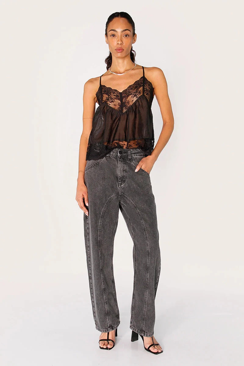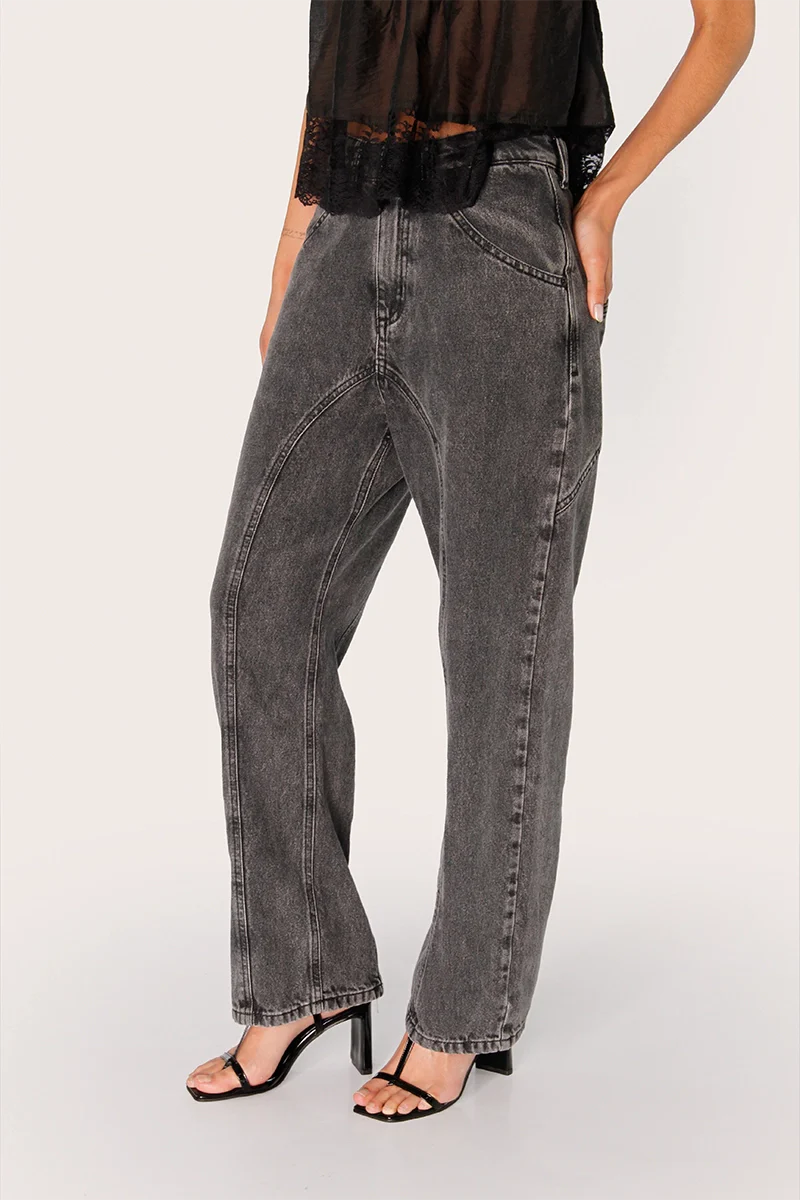 Jean Lich negro confeccionado en denim 100% algodón con cintura martillo y corte recto. Su diseño incluye recortes curvos con costuras jeaneras que recorren todo el delantero y la espalda, con hilos al tono. El largo modular llega hasta los talones, convirtiéndolo en un ítem distintivo dentro de la colección.