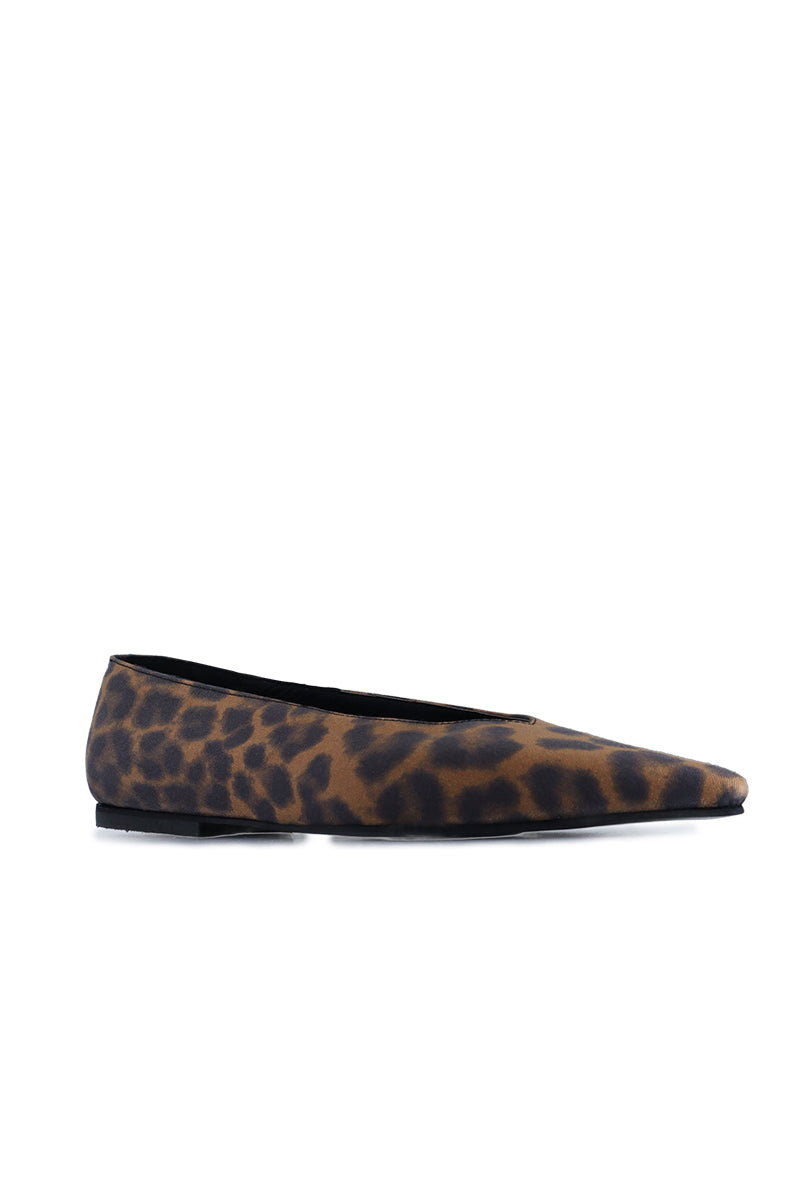 Chata de tela punta fina con talón sin forrería para doble funcionalidad al zapato. Forrería de Fibras Animal Friendly. Suela de punta diamante con doble goma en el taco.