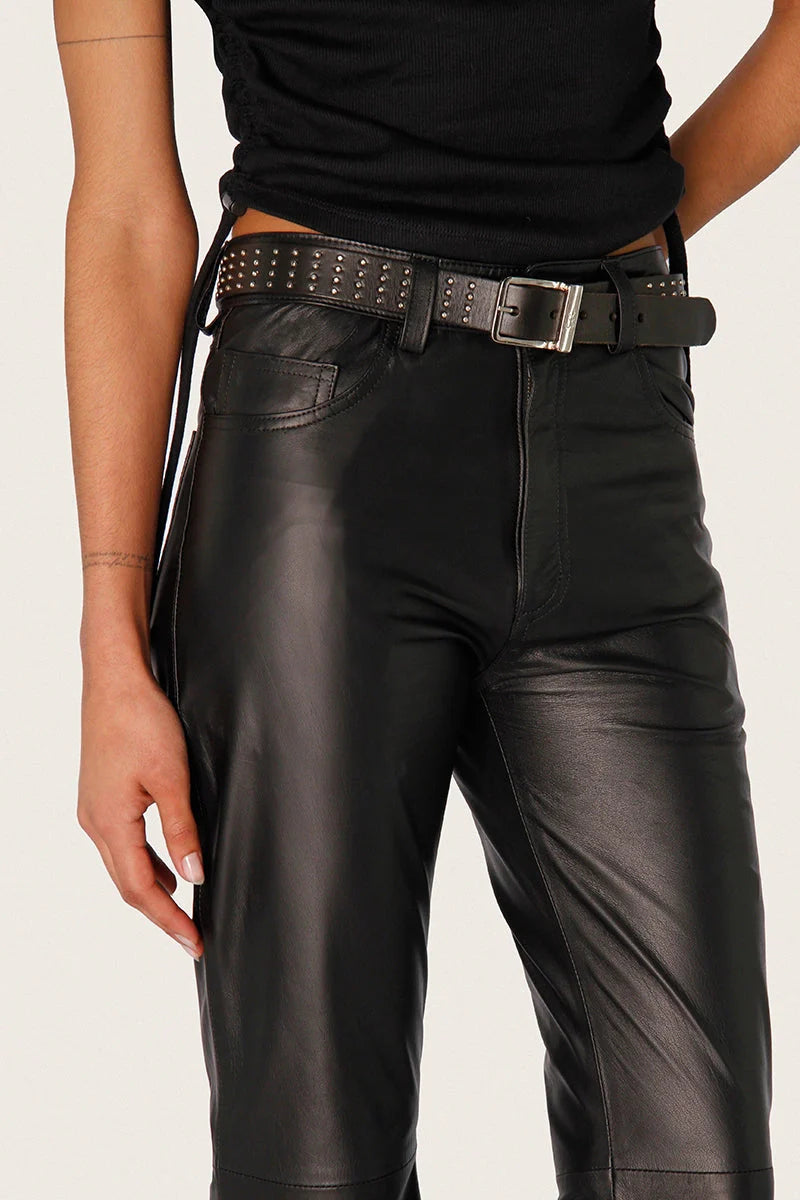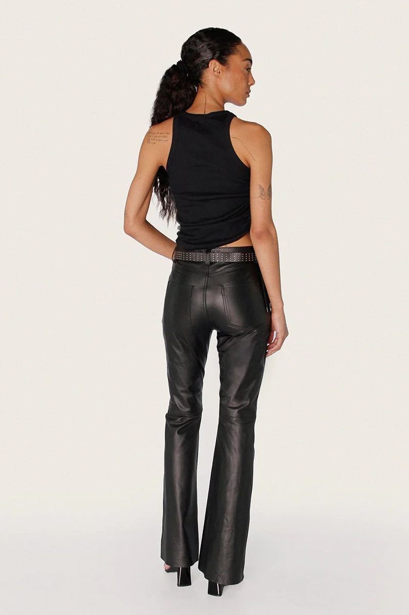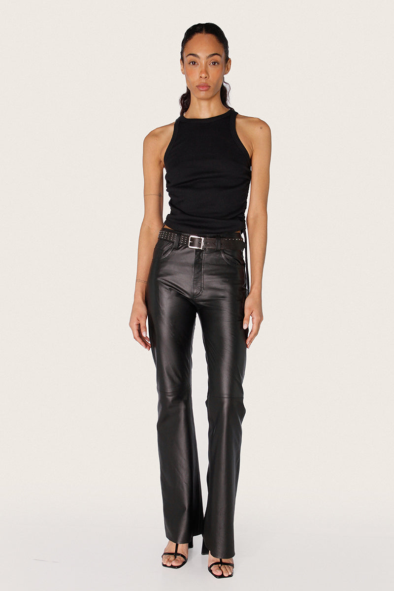 Pantalón Rium negro confeccionado en cuero suave al tacto. Su diseño presenta corte flare con recorte horizontal a la altura de las rodillas y avíos personalizados en color negro que refuerzan la estética minimalista. El largo modular llega hasta los talones, aportando una silueta estilizada y contemporánea. Una pieza para destacar en cualquier ocasión.