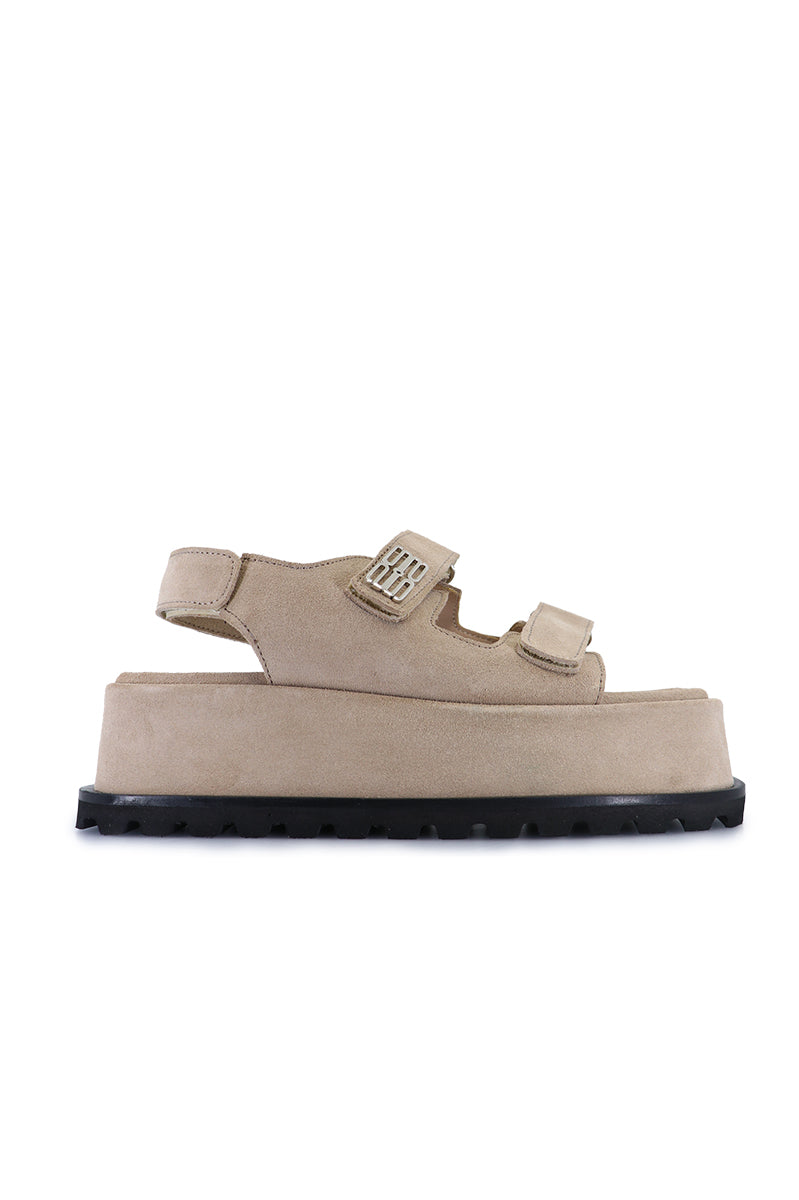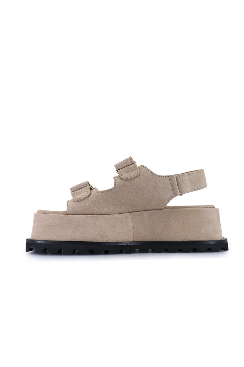 Sandalia de Fibras Animal Friendly. Con velcro en capellada y aplique de logo en lateral. Plataforma cuadrada de 3,5 cm de alto. Con suelín de goma con vira.
