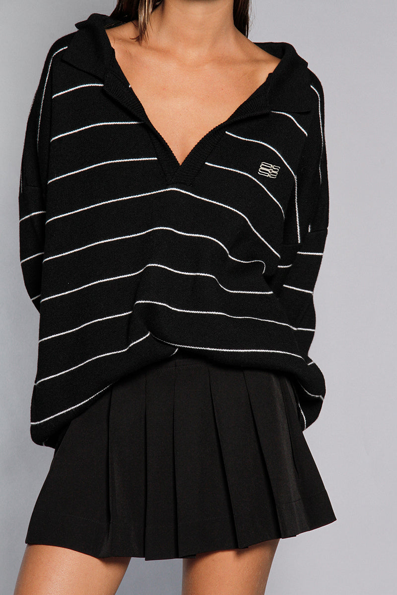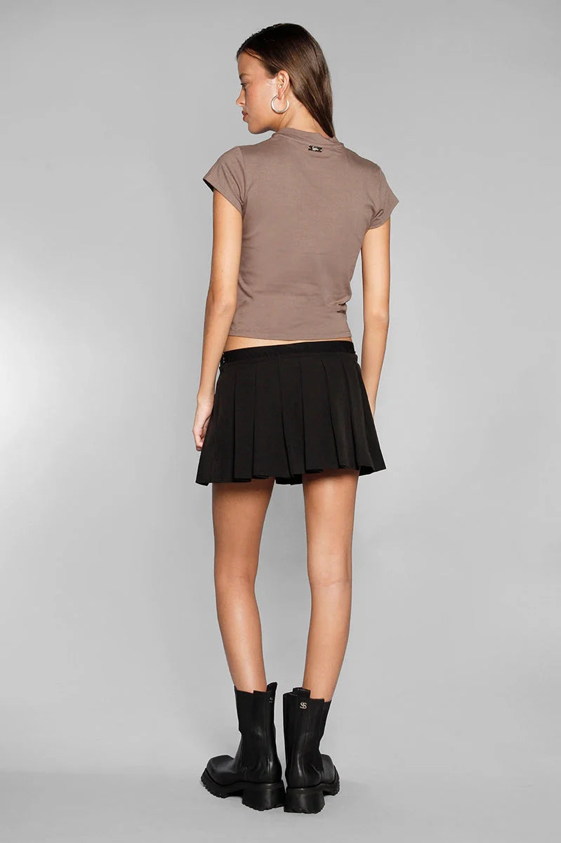 Pollera mini tableada Blas negra, con cintura con elástico personalizado LUMIARA. Su diseño moderno resalta la silueta con un toque sofisticado.