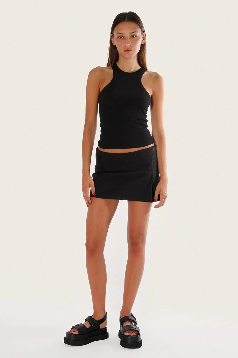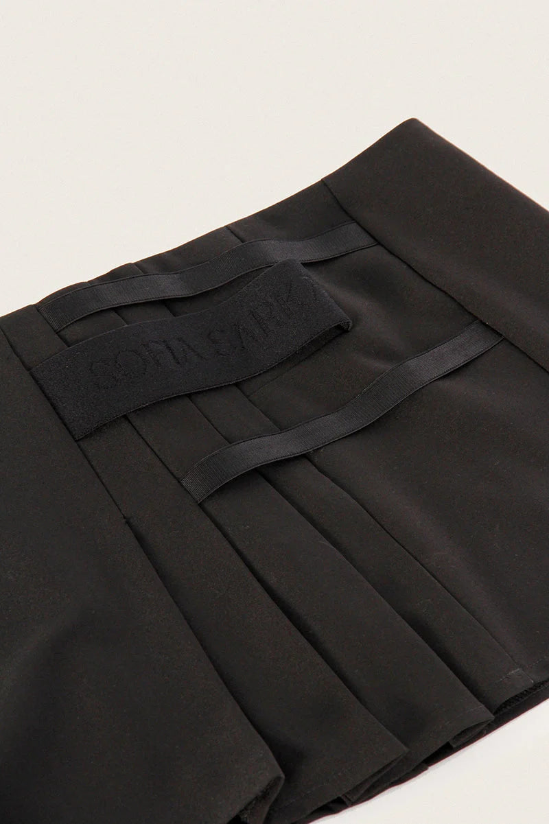 Falda Naru negra confeccionada en una tela sastrera de peso liviano. Lleva elásticos personalizados de la marca en la cintura y tablas en un lateral. Largo modular por debajo de la cola.