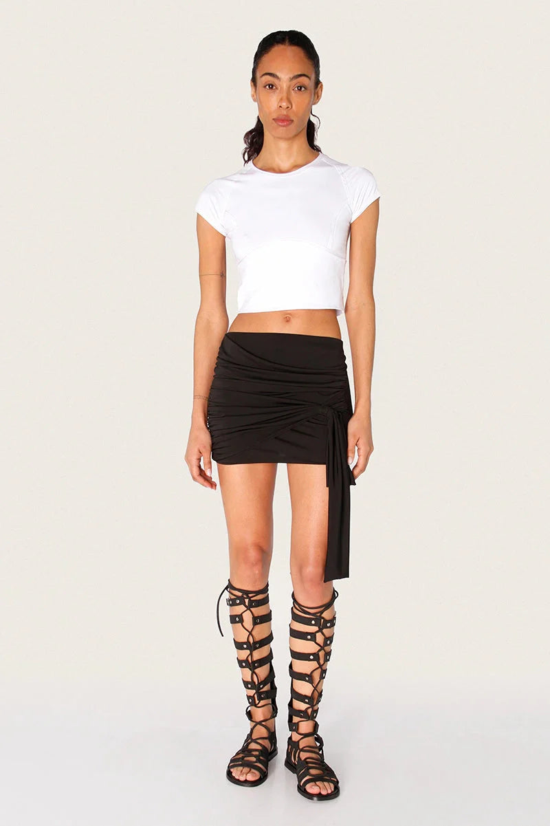 Remera Leo blanca confeccionada en jersey elastizado con mangas raglán y recortes al corte en delantero y espalda. Incluye una chapita metálica en la espalda como detalle de marca. Su textil es suave y liviano, se ajusta a la silueta del cuerpo y el largo modular llega hasta la cintura. Una prenda con diseño que suma definición a cualquier look.