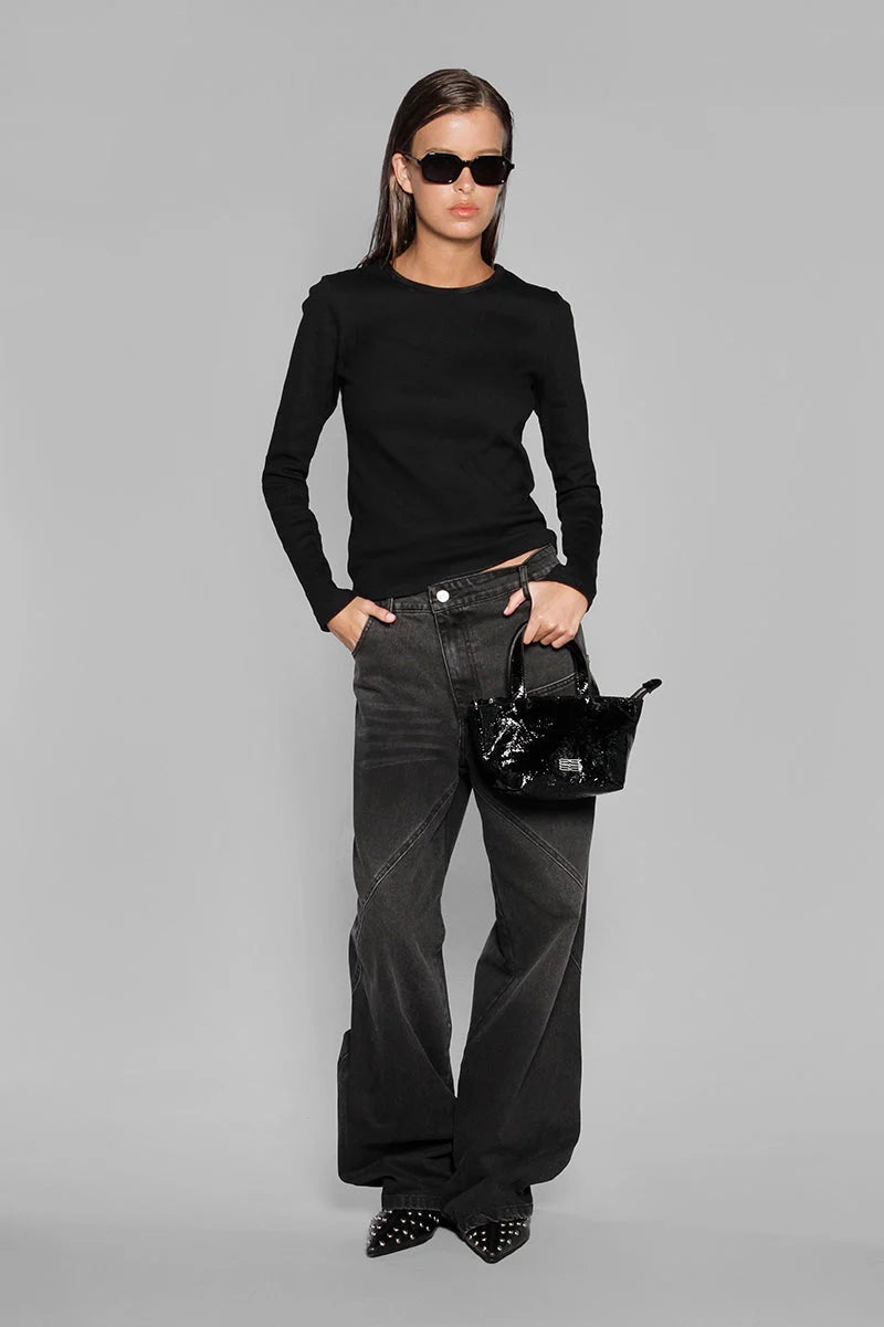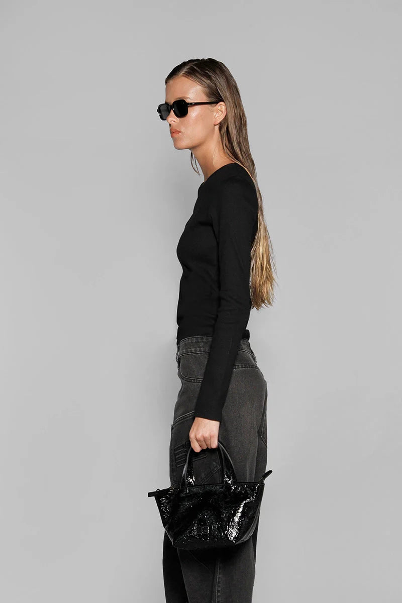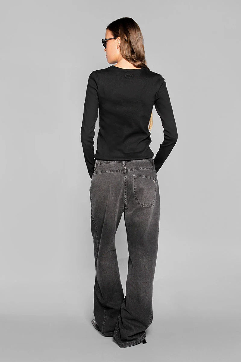 Remera Zev negra manga larga de morley, se ajusta a la silueta del cuerpo. Su textil es de una rigidez media y suave al tacto, su largo modular queda por encima de la cadera.