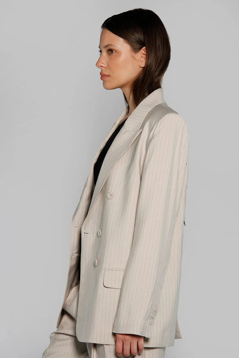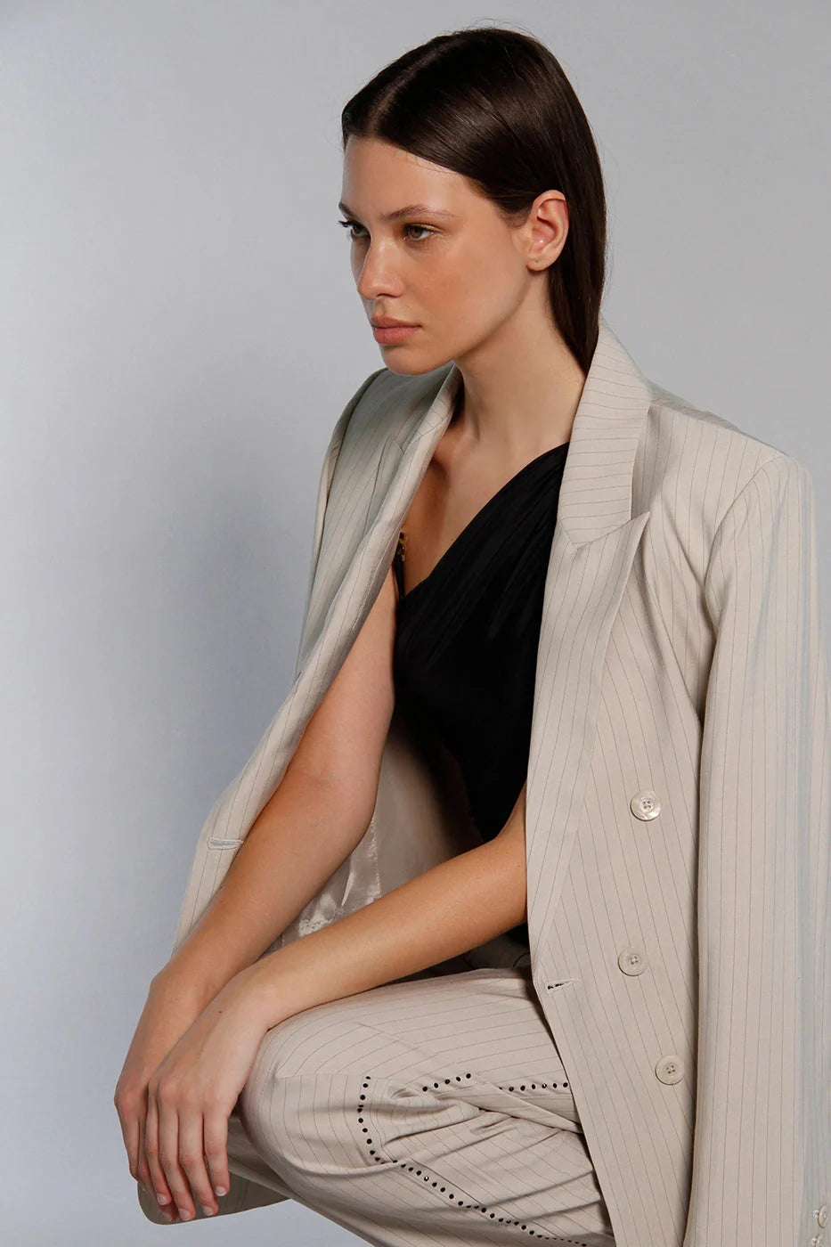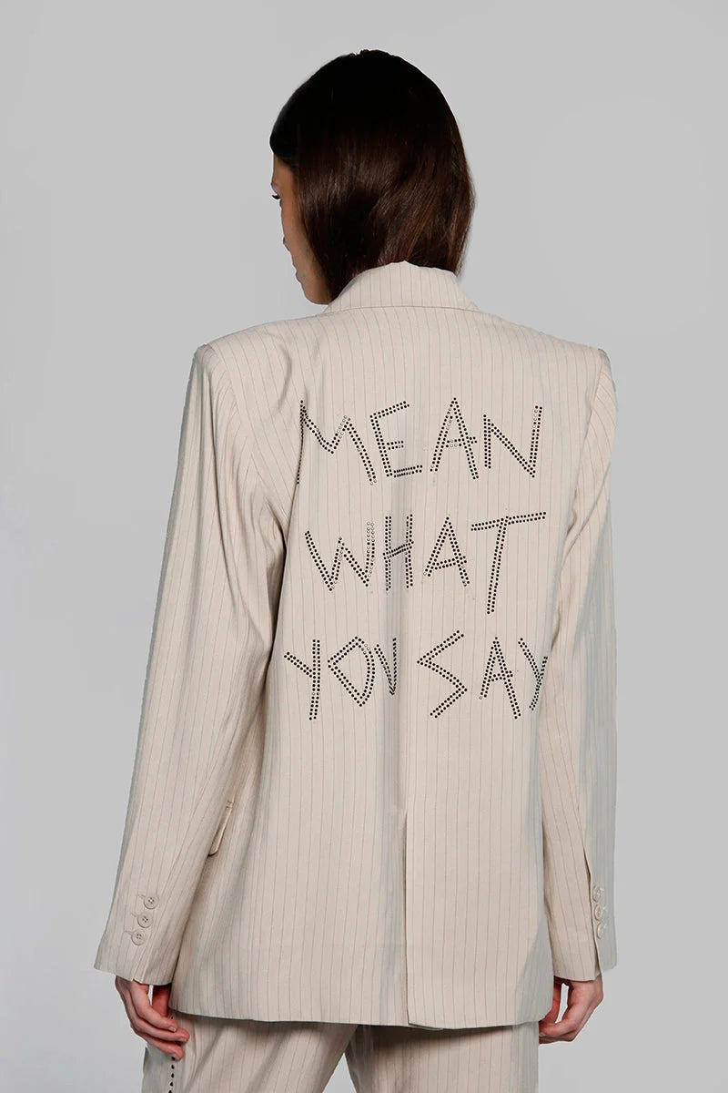 Saco sastrero Sar Visón rayado con una frase personalizada de la marca en hotfix en la espalda. Con un largo modular por debajo de la cadera y confeccionado en tela de peso medio, combina elegancia y estilo distintivo en cada detalle.
