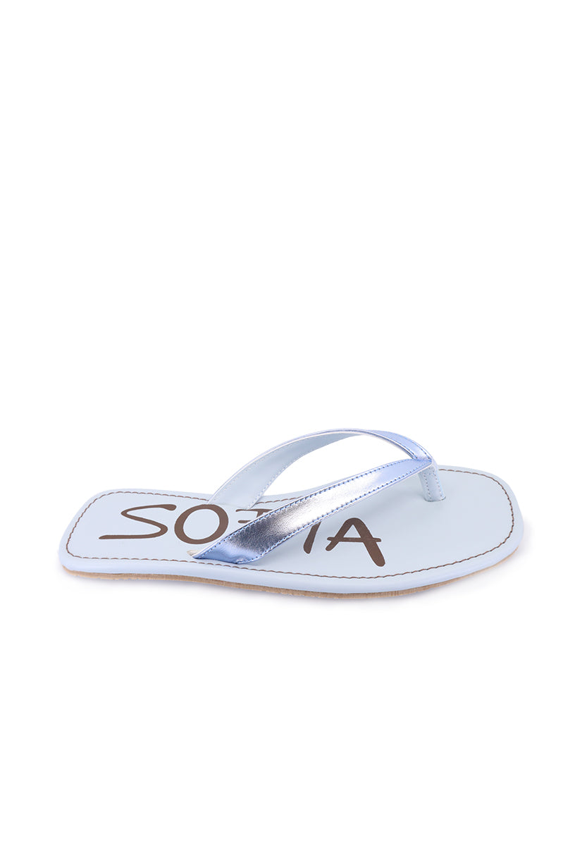 Ojota celeste de cuero metalizado, con forrerias animal Friendly. Estampa LUMIARA exclusivo de nuestra capsula CELEB. Costuras combinadas en capellada y plantilla a contra tono. Suelín de goma.