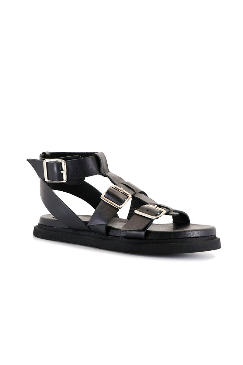 Franciscana Noxie negra de cuero vacuno. Con hebillas en capellada y pulsera. Plantilla acolchonada forrada con costuras a tono. Suelin de goma eva con una altura de 2 cm.