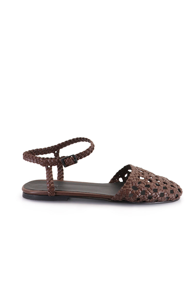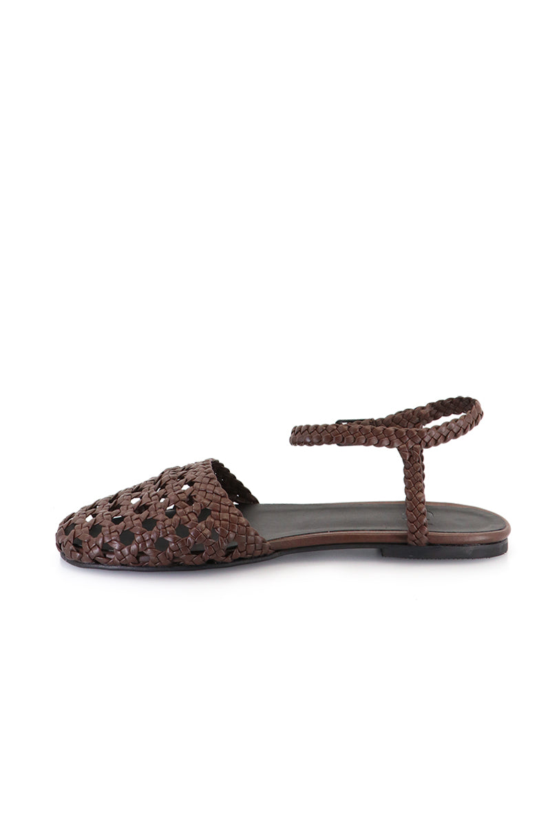 Sandalia Rilo chocolate de fibras animal friendly con capellada y tira de pulsera trenzada. Suelin de goma chilena.