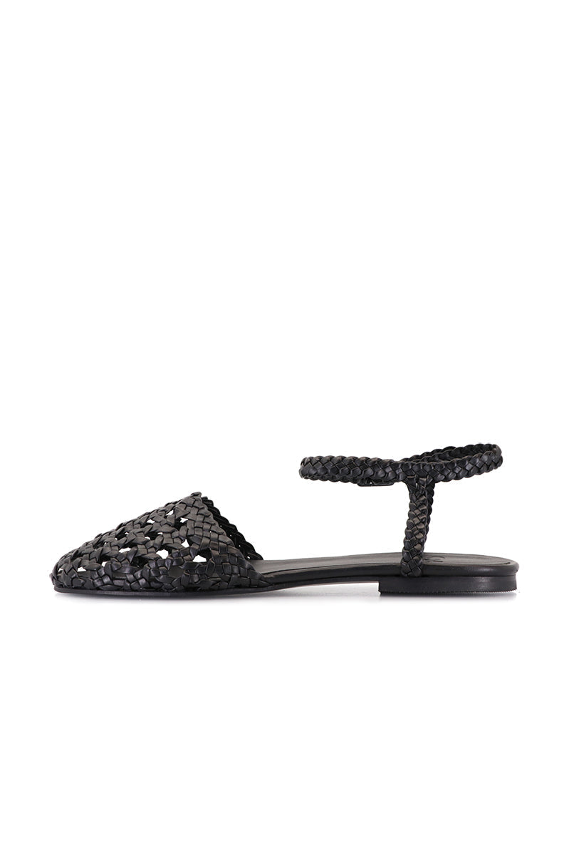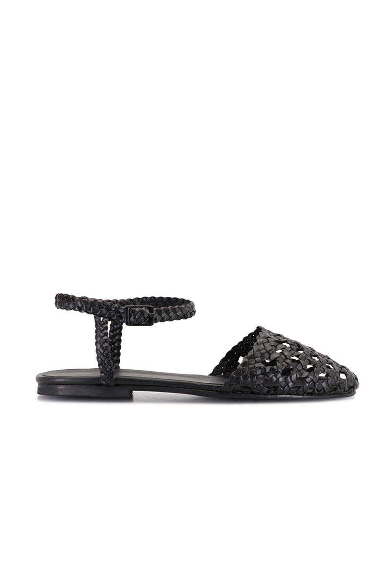 Sandalia Rilo negra de fibras animal friendly con capellada y tira de pulsera trenzada. Suelín de goma chilena.