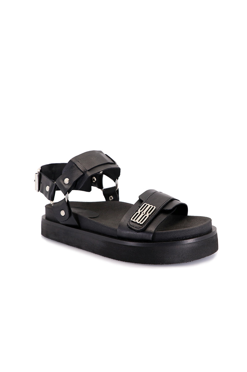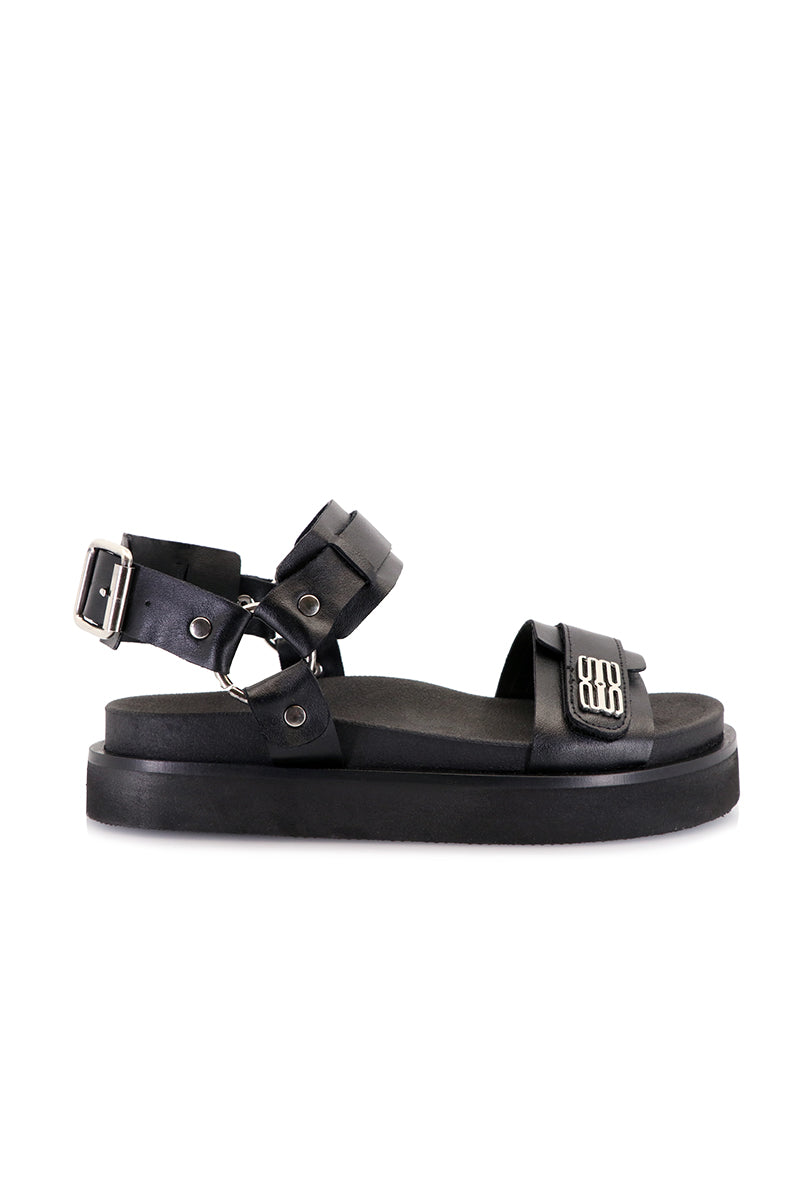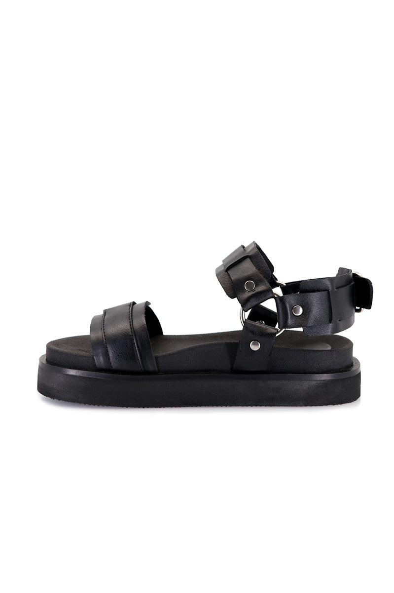 Sandalia Sina negra de fibras animal friendly, con logo en capellada y hebilla en talón. Plantilla birk con logo estampado. Suelín de goma eva.