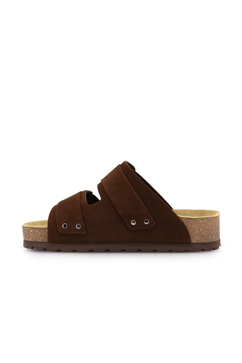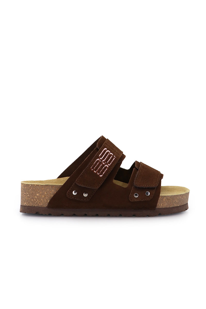 Sandalia Sofa chocolate tipo birk al corte, en gamuzón. Tira de velcro bordada a 2 colores en empeine. Plantilla anatómica y suelÍn de goma eva.