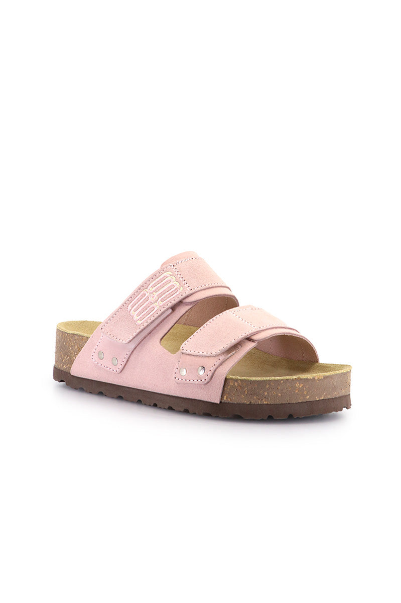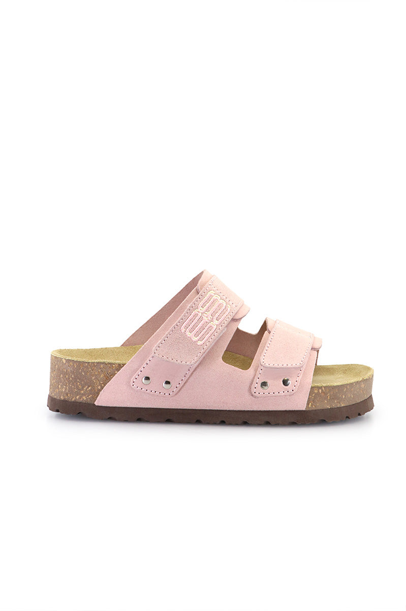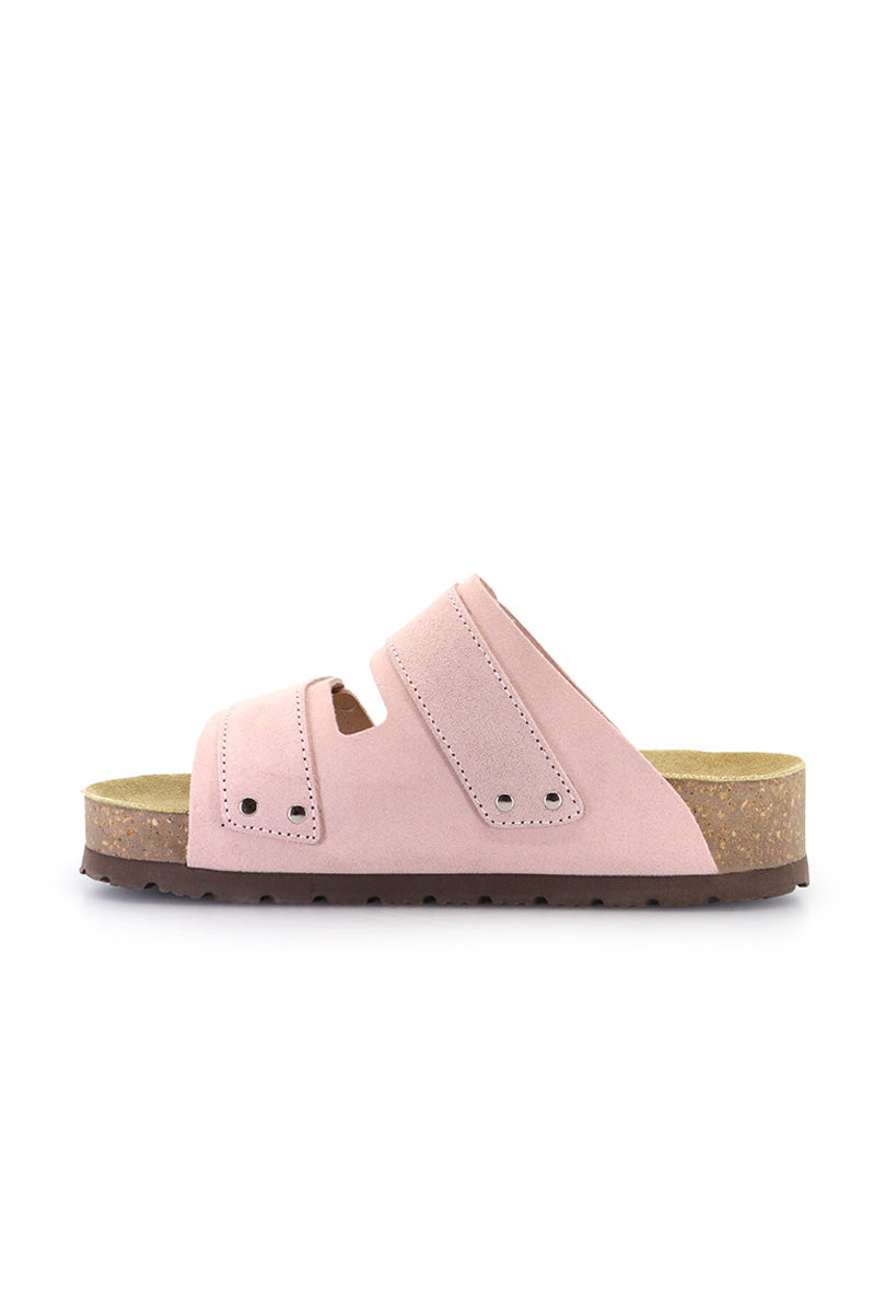 Sandalia Sofa rosa tipo birk al corte, en gamuzón. Tira de velcro bordada a 2 colores en empeine. Plantilla anatómica y suelin de goma eva.