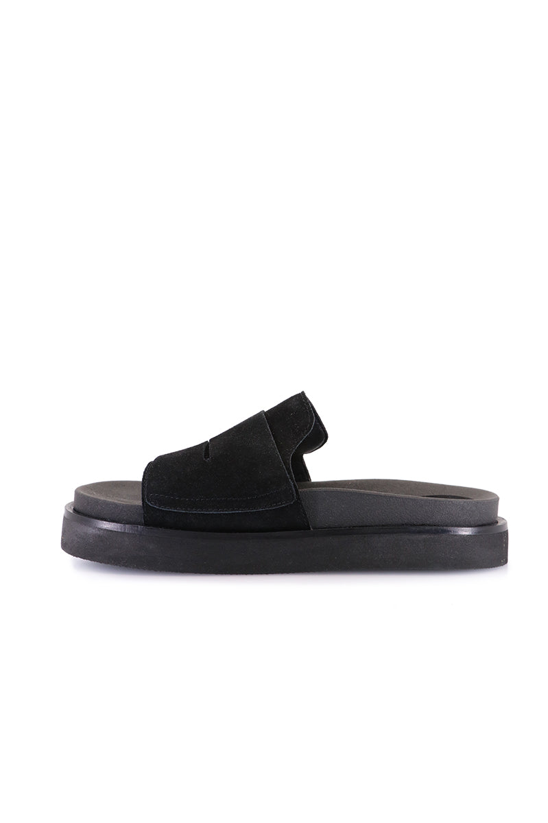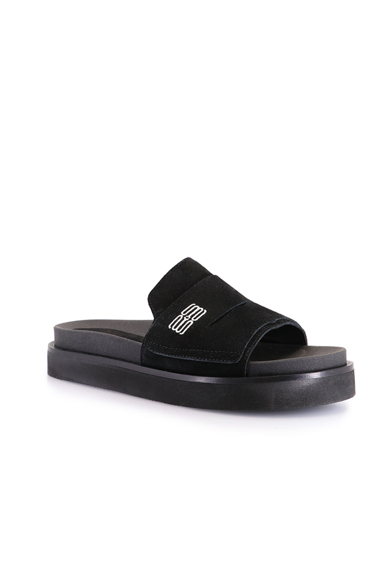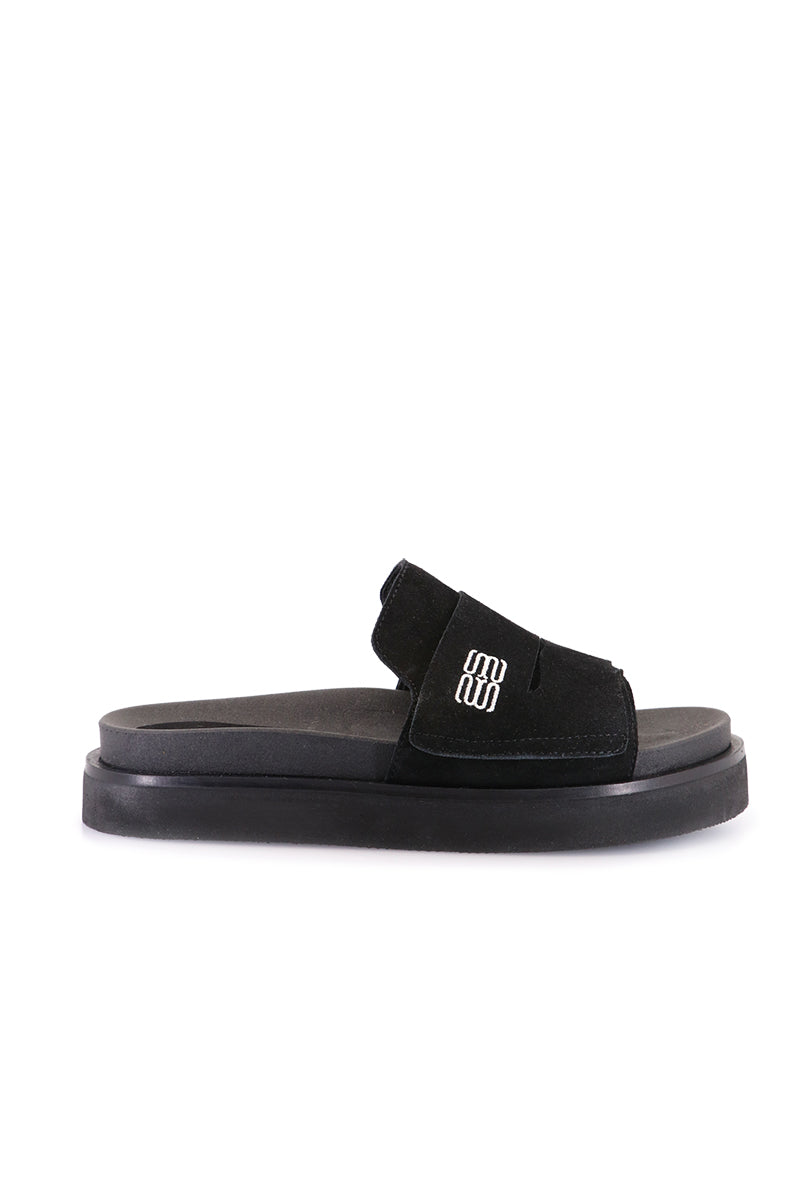 Sandalia Veka negra de fibras animal friendly con logo bordado a 2 tonos en capellada. Plantilla birk con logo estampado. Suelin de goma eva.