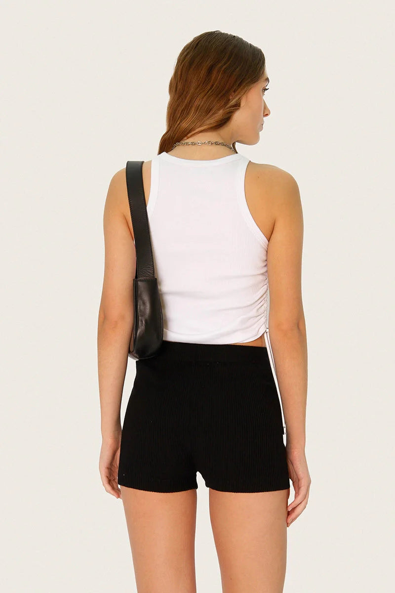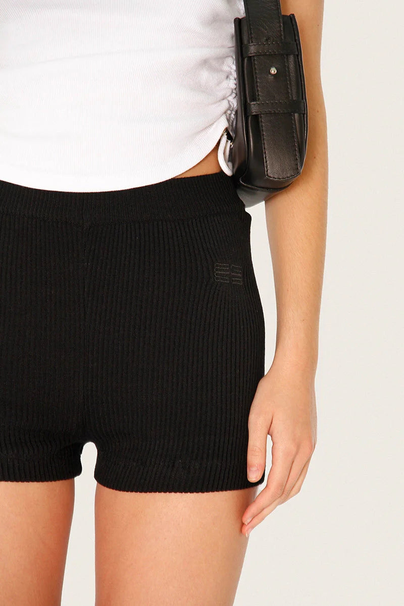 Mini short tiro alto tejido Apris negro con cintura elástica y bordado de marca a tono en la delantera. Su diseño está confeccionado en un tejido suave y liviano que aporta confort, con largo modular por debajo de la cola. Una prenda canchera ideal para acompañar tus días de verano.