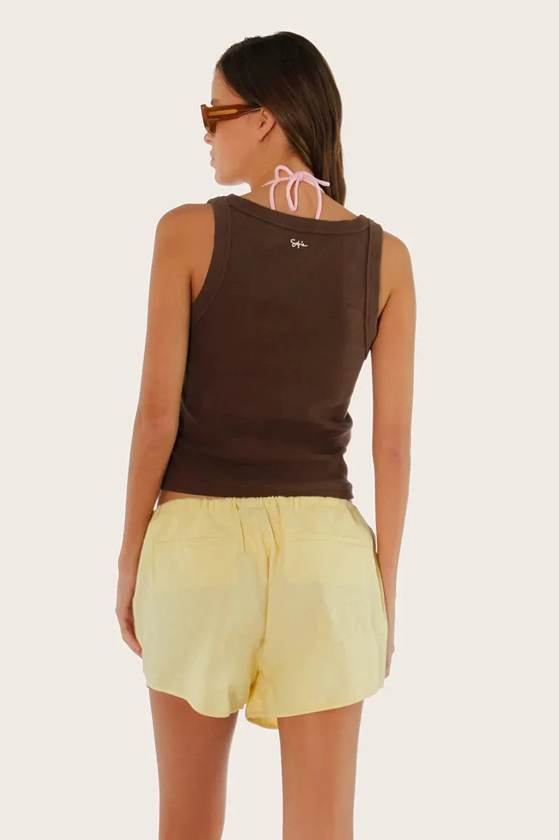 Short Ban color amarillo confeccionado en lino liviano y suave al tacto, con cintura ajustable mediante lazos en tela base. Su largo modular cae por debajo de la cola, ofreciendo un look relajado y fresco.