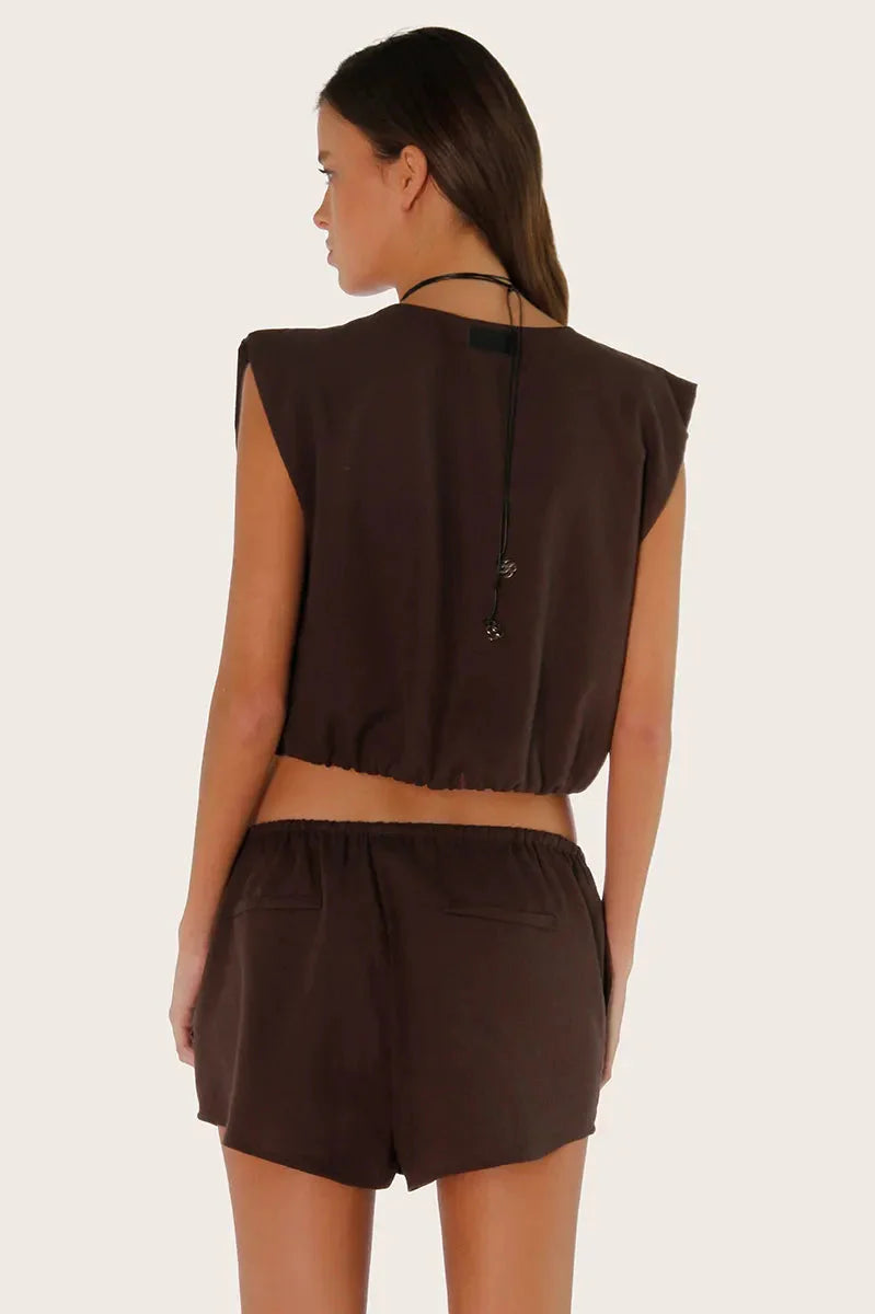 Short Ban color chocolate confeccionado en lino liviano y suave al tacto, con cintura ajustable mediante lazos en tela base. Su largo modular cae por debajo de la cola, ofreciendo un look relajado y fresco.