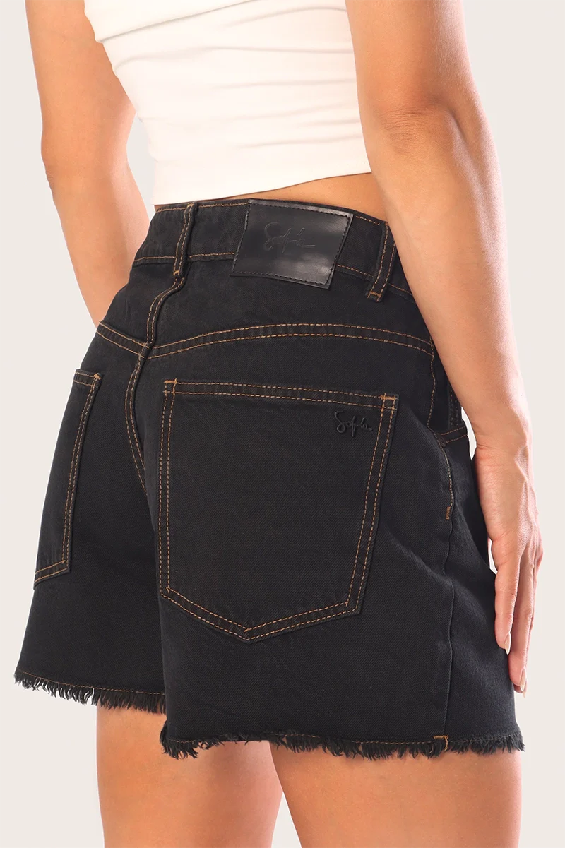 Short Barr de denim rígido color negro. fit regular, tiro alto y largo por debajo de la cola. Avios personalizados negros. Badana color negra con logo LUMIARA en espalda. Un clásico de denim pensado para sumar a tus looks de temporada.