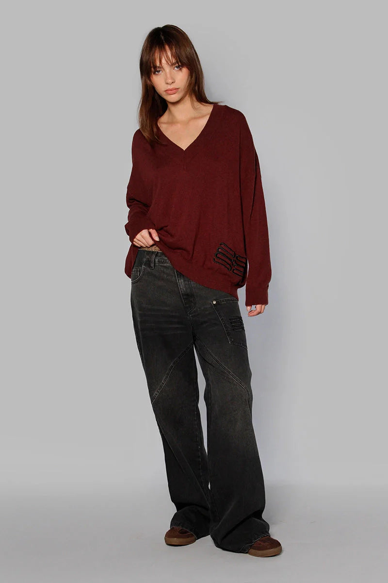 Sweater Eve bordo con escote en V. Está confeccionado en tejido suave y liviano que aporta una mejor caída. Su largo modular llega por debajo de la cadera, ideal para un look cómodo y sofisticado.