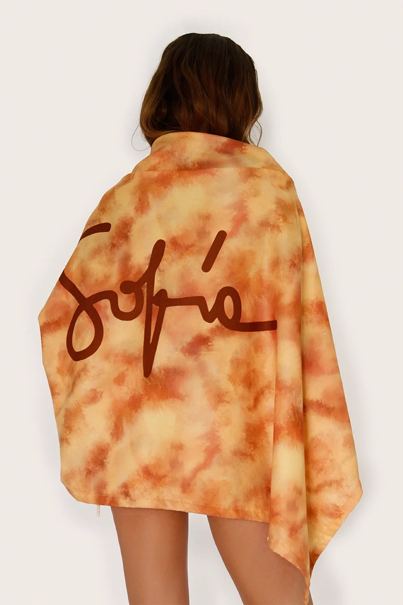 Toalla Tiks multicolor de microfibra full print personalizada de la marca con el logo centrado grande. Su tamaño es de 85 x 155 cm.