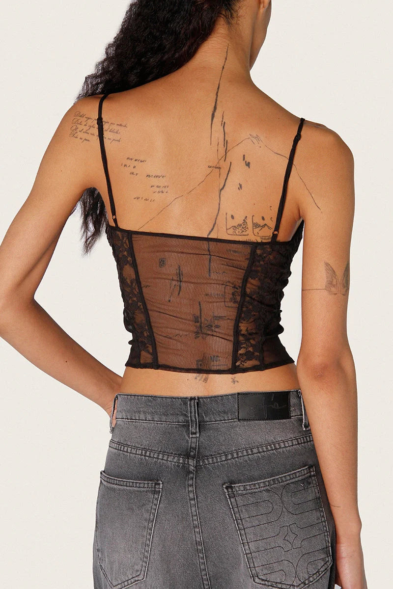 Top Cet negro estilo corset en combinación de mesh y encaje. Su busto doble evita transparencias y los recortes corseteros realzan la figura. Tela elastizada y liviana con acceso directo por la cabeza.