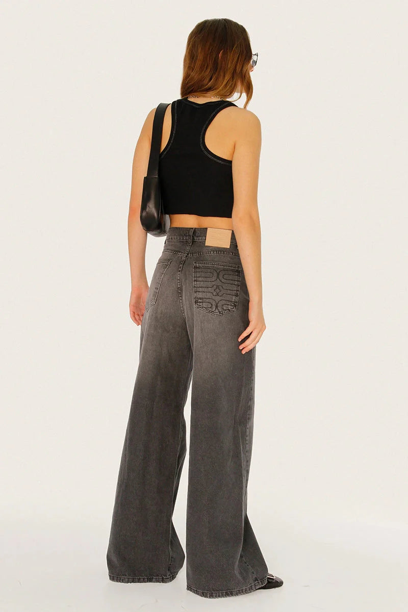 Top Elvi negro de morley crop confeccionado en hilado de peso medio. Presenta escote cuadrado, collareta en cuello y sisas, y ruedo al corte. Incluye logo bordado a contratono en el frente. Largo modular por debajo del busto, ideal para un look actual y canchero.