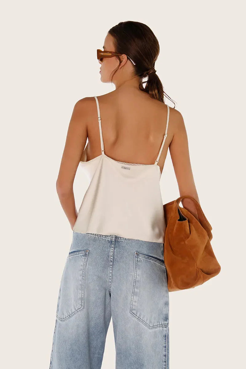 Top Miti crudo de satén con escote en V y frunce bajo el busto. Detalles de puntilla a tono en los bordes, botones forrados al frente y breteles regulables. Tela de tacto suave y largo modular hasta la cintura. Perfecto para un look elegante.