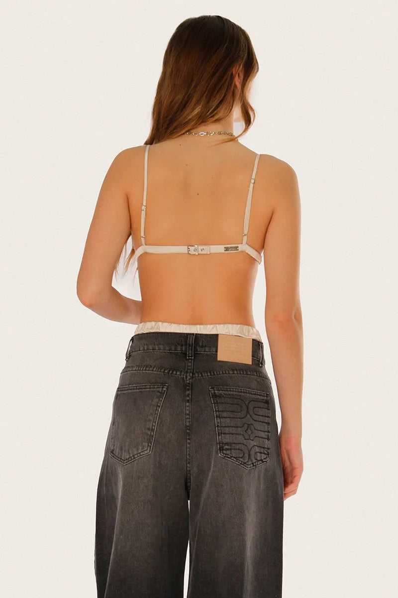 Corpiño triangulito Umy crudo de seda con puntilla a tono. Presenta acceso en espalda mediante cinturón con hebilla ajustable y breteles regulables. Tela liviana y suave al tacto para mayor comodidad.
