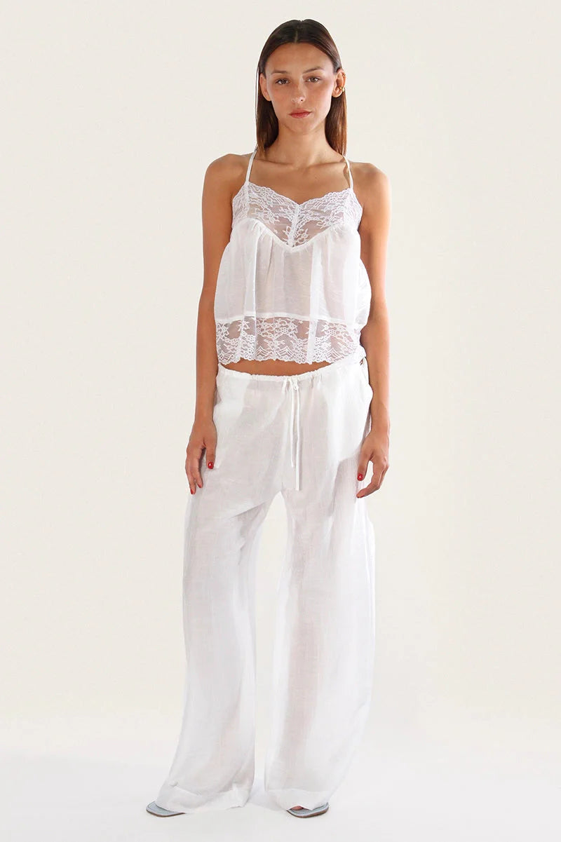 Top Xim off white de seda translúcida con puntilla y escote en V. Presenta breteles regulables y frunce bajo busto que genera vuelo en el ruedo. Incluye chapa metálica de la marca en la espalda. Tela suave y liviana con largo modular por debajo de la cintura. Sofisticado y versátil.
