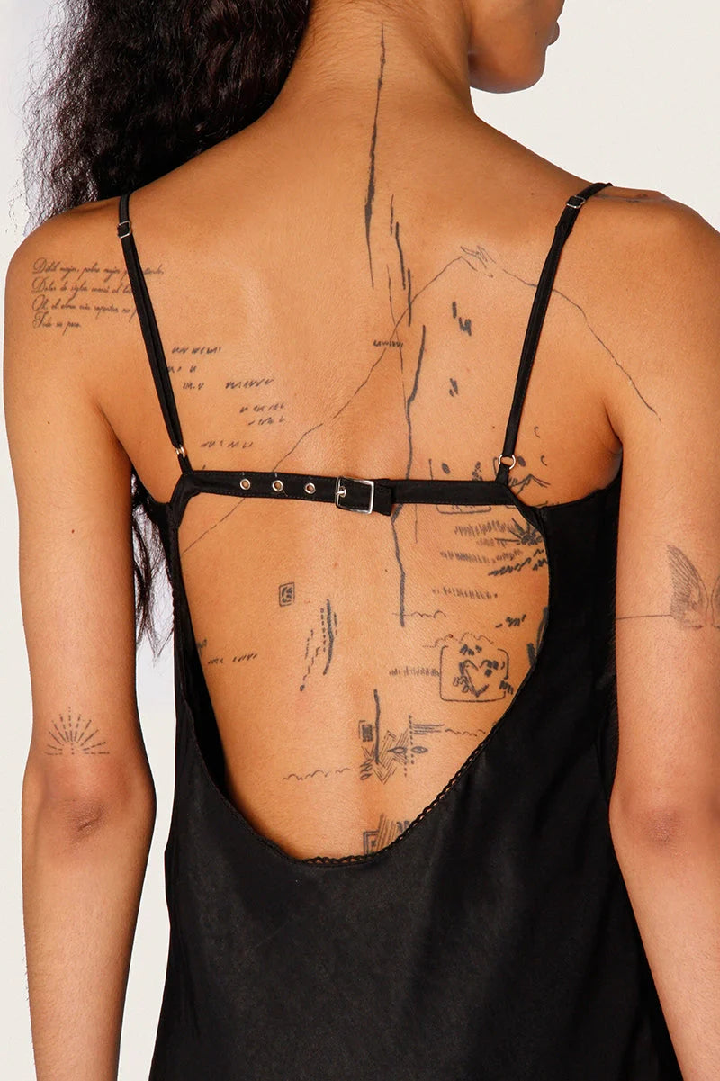 Vestido Clasi negro de seda liviana con escote redondeado y recorte bajo busto. Breteles regulables para un ajuste cómodo, con detalles de picot en escote y tajo delantero que aporta movimiento. La espalda cavada suma un diseño distintivo y el largo modular hasta los talones lo convierte en una pieza ideal para eventos de día o de noche.