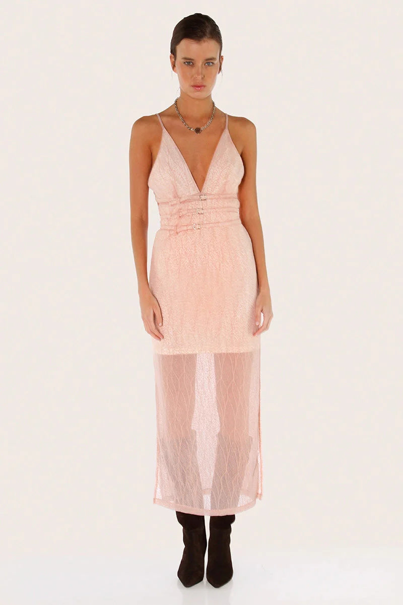 Vestido Yanz rosa de encaje translúcido con forrería oscura desde el busto hasta por debajo de la cola. Presenta escote en V y tres cinturones decorativos en el bajo busto que aportan un detalle distintivo. Su espalda baja llega hasta por encima de la cola y cuenta con tajos laterales hasta la rodilla que suman movimiento. Confeccionado en un textil suave y liviano, su largo modular es hasta los tobillos. Un ítem pensado para sumar estilo en cualquier ocasión.