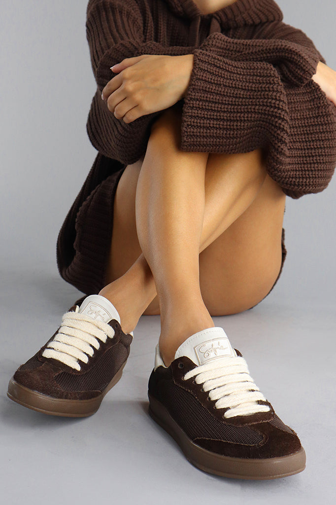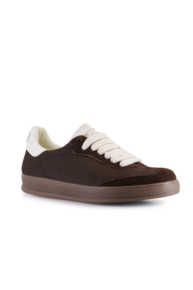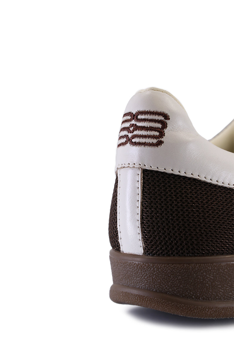 Zapatilla Rron marrón, combinada en mesh, cuero y gamuzón. Talón estampado SS. Lengueta bordada con LUMIARA relleno. Fondo inyectado a tono del corte.