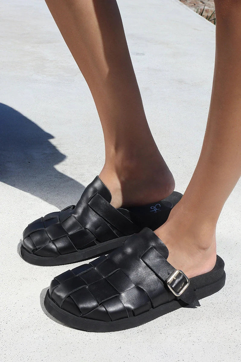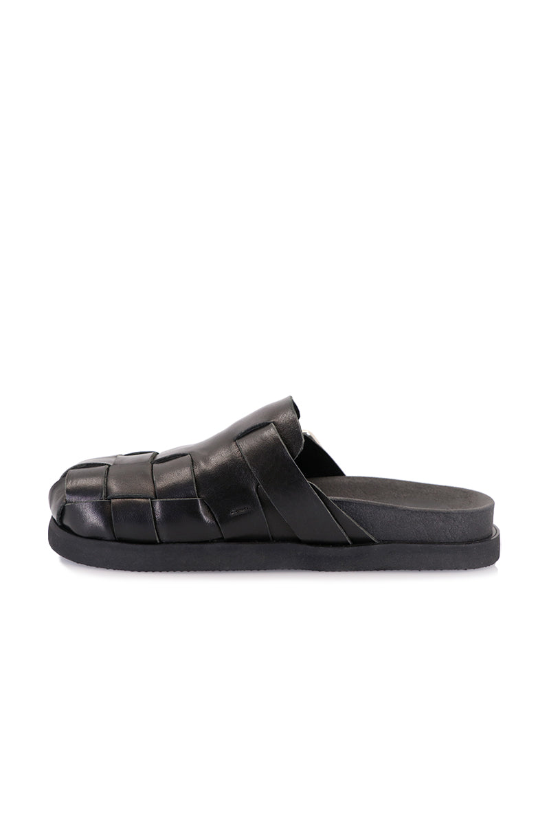 Zueco Nash negro confeccionado en cuero vacuno trenzado que aporta textura al diseño. Presenta detalle de hebilla en el empeine. Su plantilla anatómica asegura confort en cada uso, acompañada de suelín de cuero flex. Un modelo que combina comodidad con estilo.